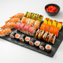 1/2 Филадельфия с тунцом, 1/2 Филадельфия с угрем, 1/2 Филадельфия с лососем, 1/2 Филадельфия с тигровой креветкой, 1/2 Авокадо ролл с тунцом, 1/2 Чиз ролл с тостовым сыром, 1/2 Мини