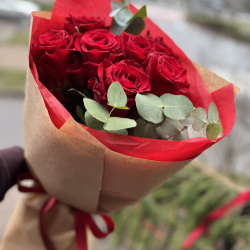 Cклад: 7 червоних троянд, евкаліпт, пакування.